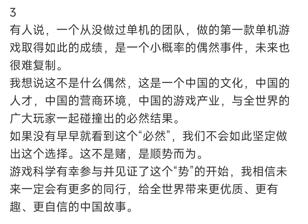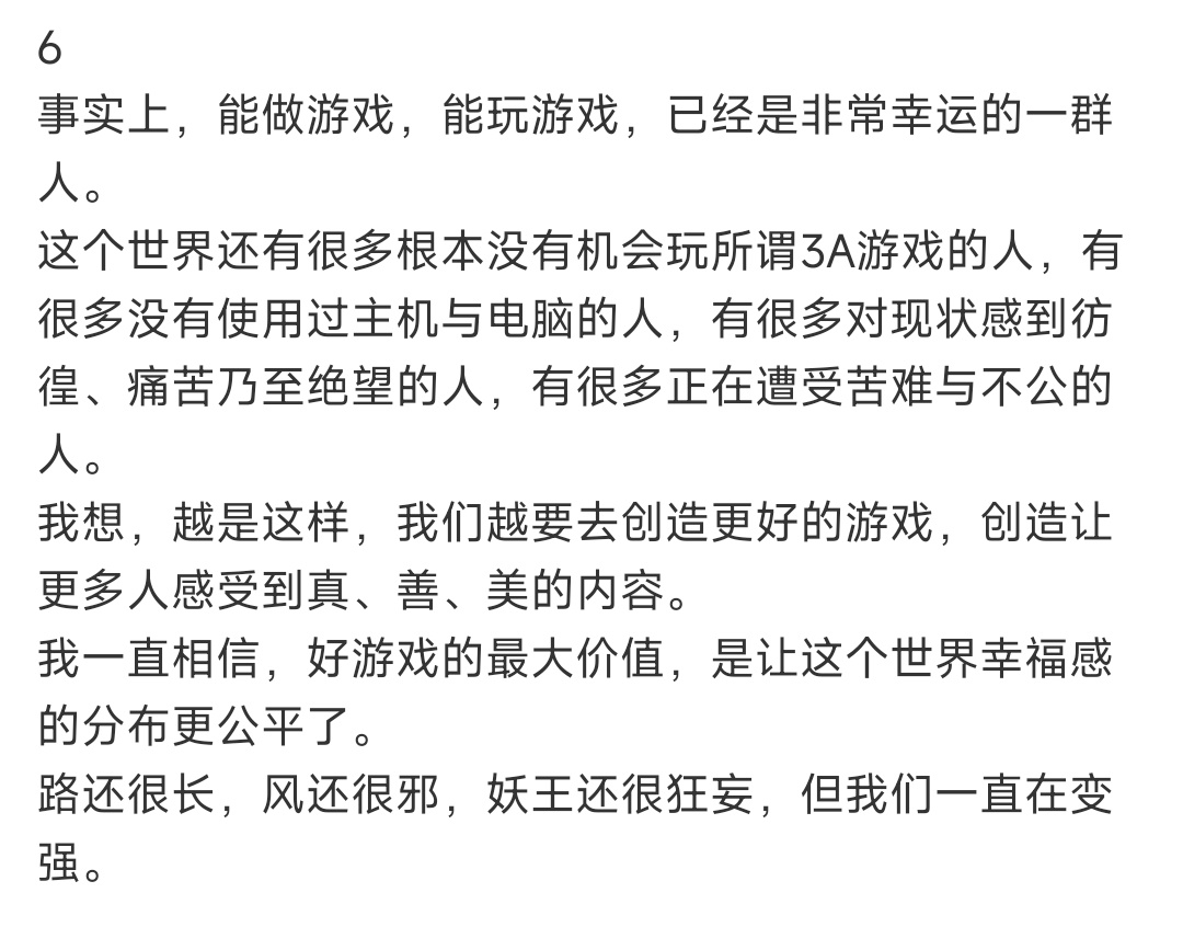 - 世界上的苦難太多了,我們有機會能做好一款遊戲、玩到一款好遊戲已經是幸運兒了,要珍惜自己現有的環境、現有的機會,所以遊戲科學想做的遊戲,需要傳達正確的價值觀,傳達美好的東西,讓玩家們感到滿足和幸福一直是我們的目標