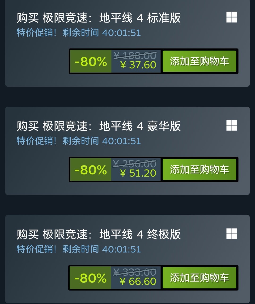 个人觉得《地平线4》这款游戏不管你是竞速开车游戏爱好者,还是把他单纯当做风景模拟器收藏都是很值得入手的,现在价格是二折平史低,按Steam官方标注折扣还有最后40小时