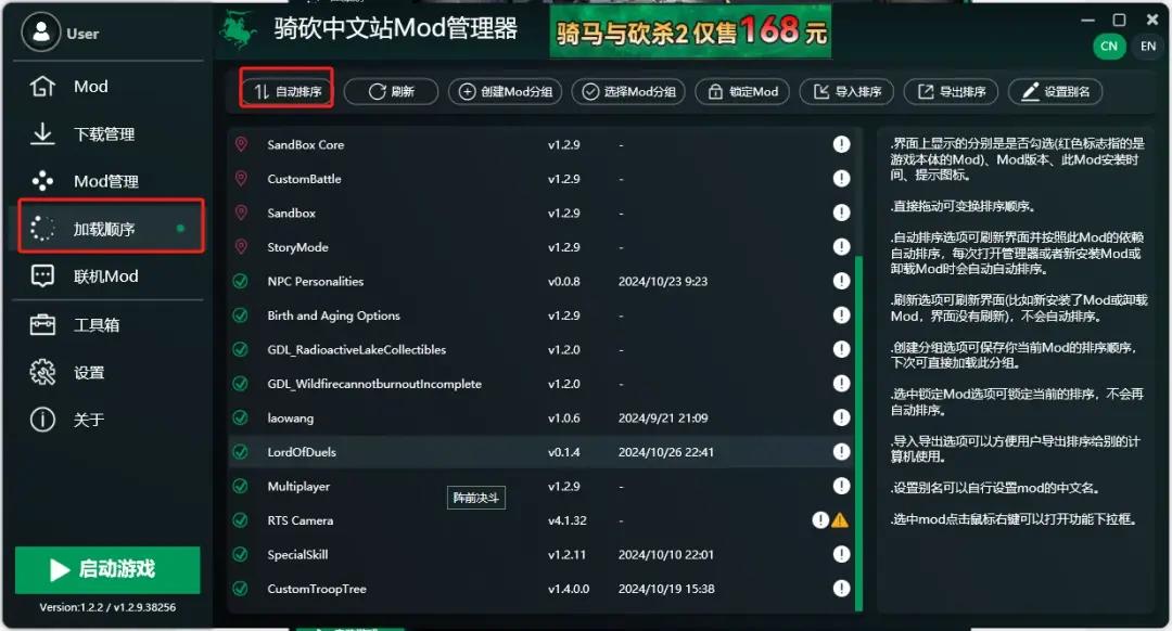 4、在加載順序選項中,點擊自動排序後再點擊啓動遊戲即可進入Mod