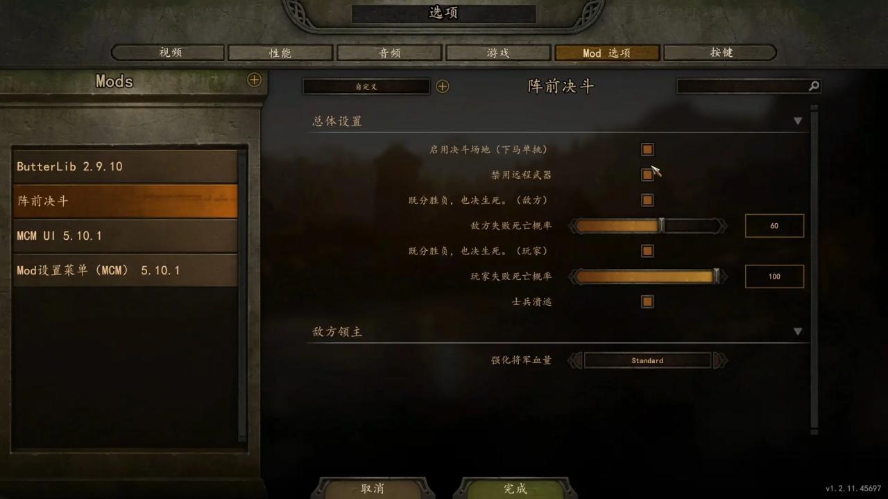 戰場上的決鬥,從來都是你死我活。玩家可以在MOD選項裏激活敵我雙方可以戰死的選項,還能調整死亡的概率。如果處於決鬥中,致命一擊不是來自於決鬥對手,而是被其他士兵擊殺的話則不會觸發死亡效果。由決鬥觸發的死亡是不會受到陣營關係的懲罰哦!