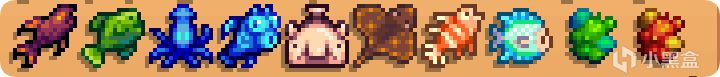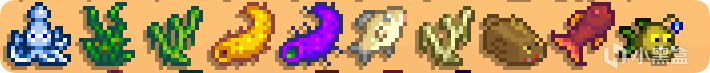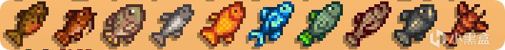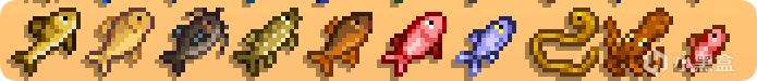 第七排:虛空鮭魚 史萊姆魚 午夜魷魚 幽靈魚 水滴魚 黃貂魚 獅子魚 藍鐵餅魚 河凝膠 洞穴凝膠
