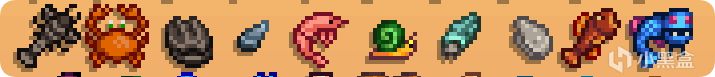 第六排:小龍蝦 螃蟹 鳥蛤 蚌 蝦 蝸牛 玉黍螺 牡蠣 木躍魚 冰川魚
