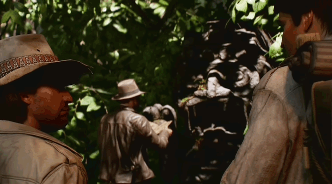 接下来故事的发展和我们知道的一样,印第安纳 · 琼斯在雨林里穿梭,解开谜题,拿到了山洞中的宝藏,同时也诱发了机关。