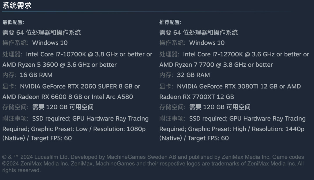 配置这方面要求确实有点吓人, steam 上推荐配置如下,用硬件小白也懂的话介绍一下:显卡比 RTX 2060 SUPER 8GB 垃圾的估计没法玩。
