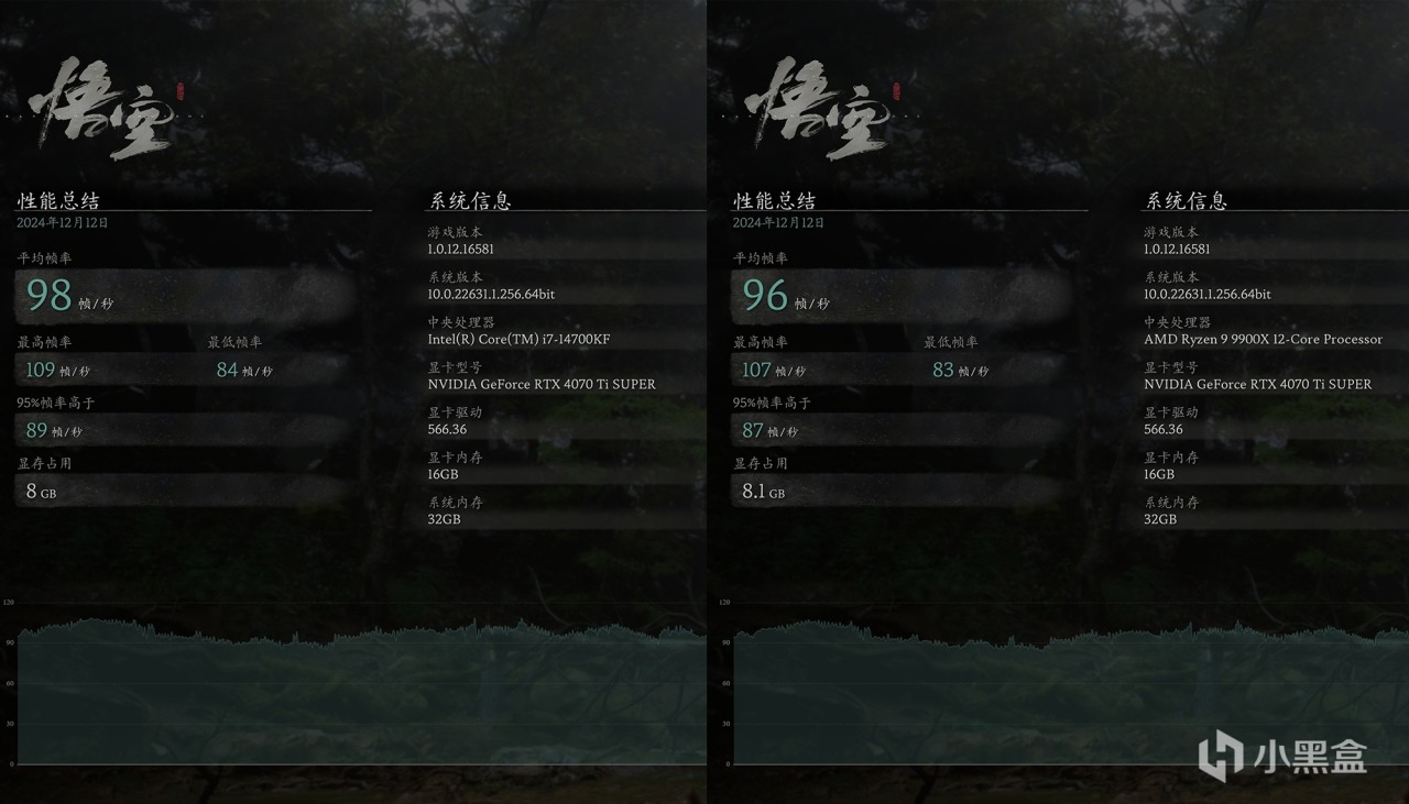 既然来都来了,接下来测试一下这两款处理器在4K画面下的游戏性能表现如何,均使用影驰RTX 4070 Ti Super金属大师显卡,首先测试国产大作《黑神话:悟空》,这是更新后的版本,使用了游戏内置推荐设置等级,开启DLSS超分辨率采样,50超采样清晰度,并开启帧生成,其它画面质量均为超高,实测i7-14700KF处理器的平均游戏帧率为98FPS,最低帧率为84FPS,锐龙9 9900X处理器的平均游戏帧率为96FPS,最低帧率为83FPS。