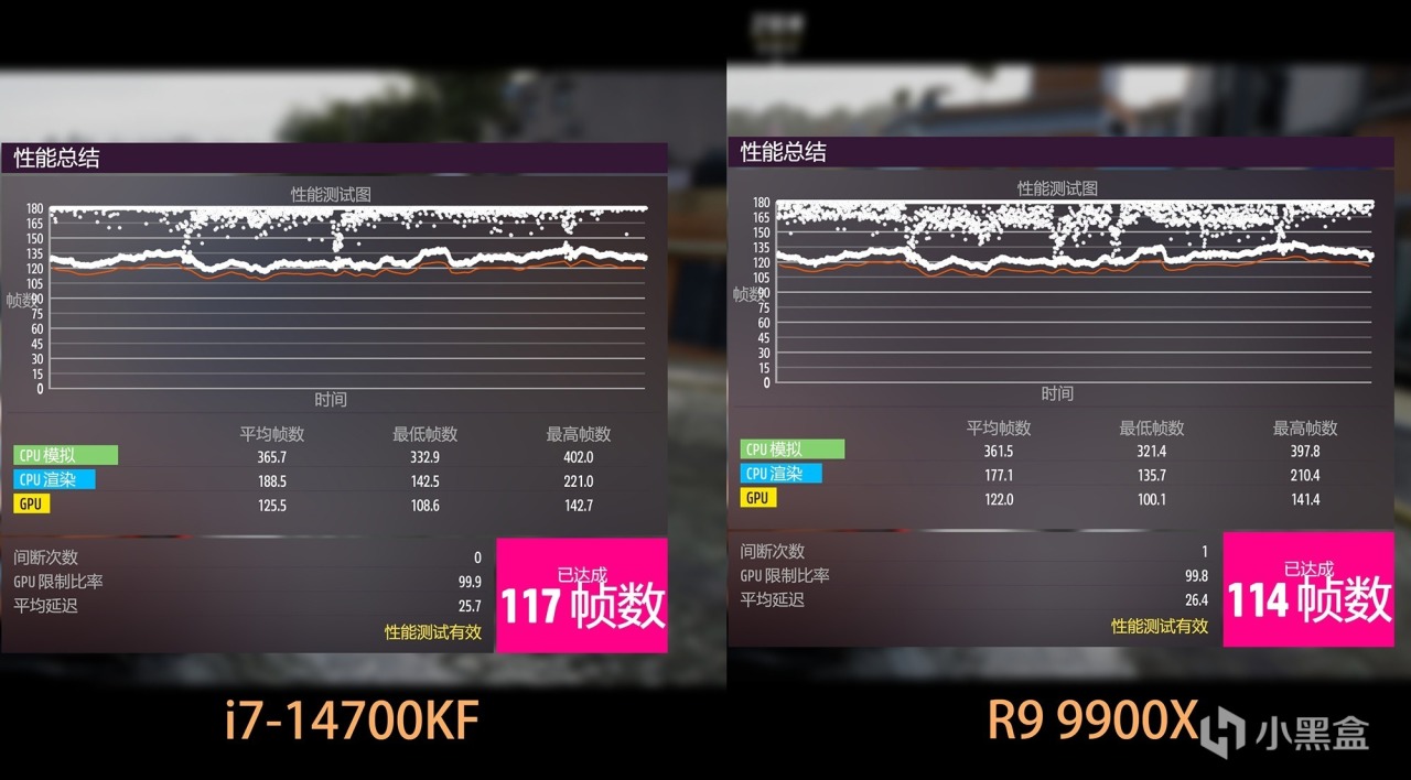《赛博朋克2077》在2K分辨率相同画质设定下平均帧能到130FPS以上,4K分辨率直接掉至61FPS,竞速类游戏《极限竞速:地平线5》,选择了极端档位的预设画面,关闭DLSS超采样,开启TAA抗锯齿效果,利用游戏内置基准测试功能,i7-14700KF处理器的平均游戏帧率为117FPS,锐龙9 9900X处理器的平均游戏帧率为114FPS。