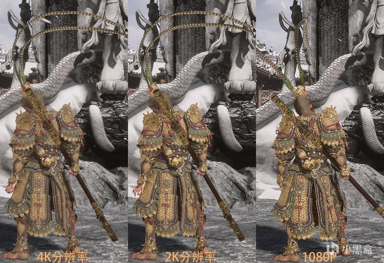 以《黑神话:悟空》游戏为例,1080P、2K与4K三种不同分辨率的游戏画面进行对比,通过悟空的建模很容易看出在不同分辨率下的清晰度差异,游戏画面细腻程度简直就是两个世界,在4K画面下肩甲上红绳纹理肉眼可见,也让远处的场景更为细腻和突出,而在2K画面下基本上没什么纹理,更别说全高清分辨率了。