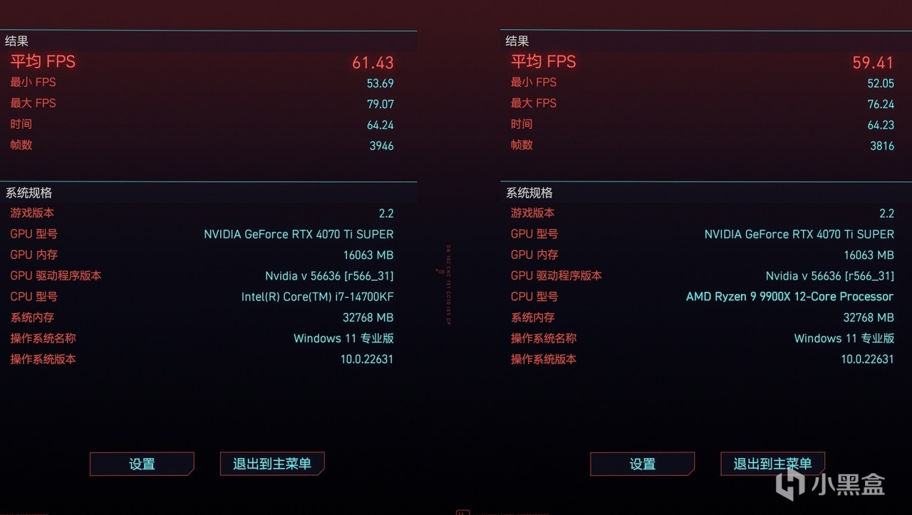 《赛博朋克2077》最新的2.2版本,在游戏中选择最高的超级预设画质档位,默认是FSR超采样模式,手动切换至DLSS超采样与质量档位,无光线追踪效果,利用游戏的内置基准测试功能,i7-14700KF处理器的平均游戏帧率为61.43FPS,最小帧率为53FPS,锐龙9 9900X处理器的平均游戏帧率为59.41FPS,最小帧率为52.05FPS。