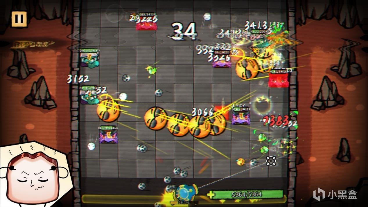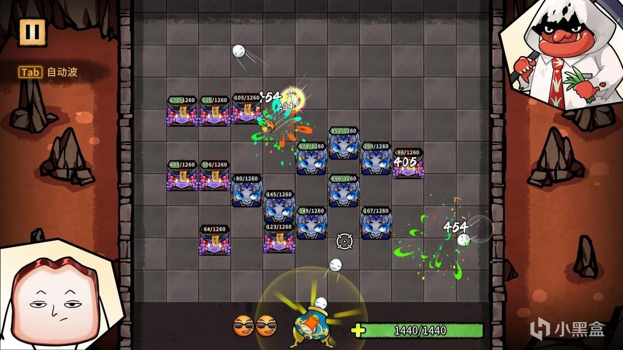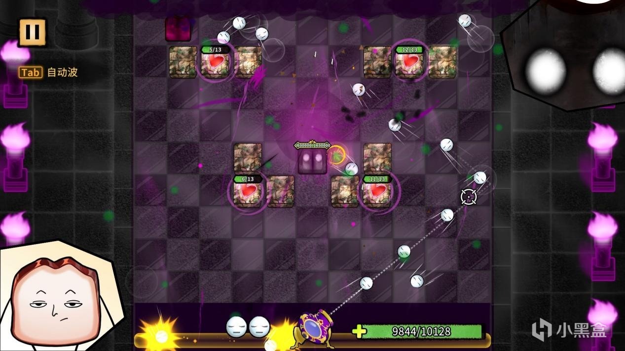 每次战斗会在场中生成大量的鬼怪砖块,砖块持续向前方推进,直到通过撞击边缘对玩家造成伤害。而应对的唯一方法在于:通过灵魂大炮射出弹珠来消灭它们!