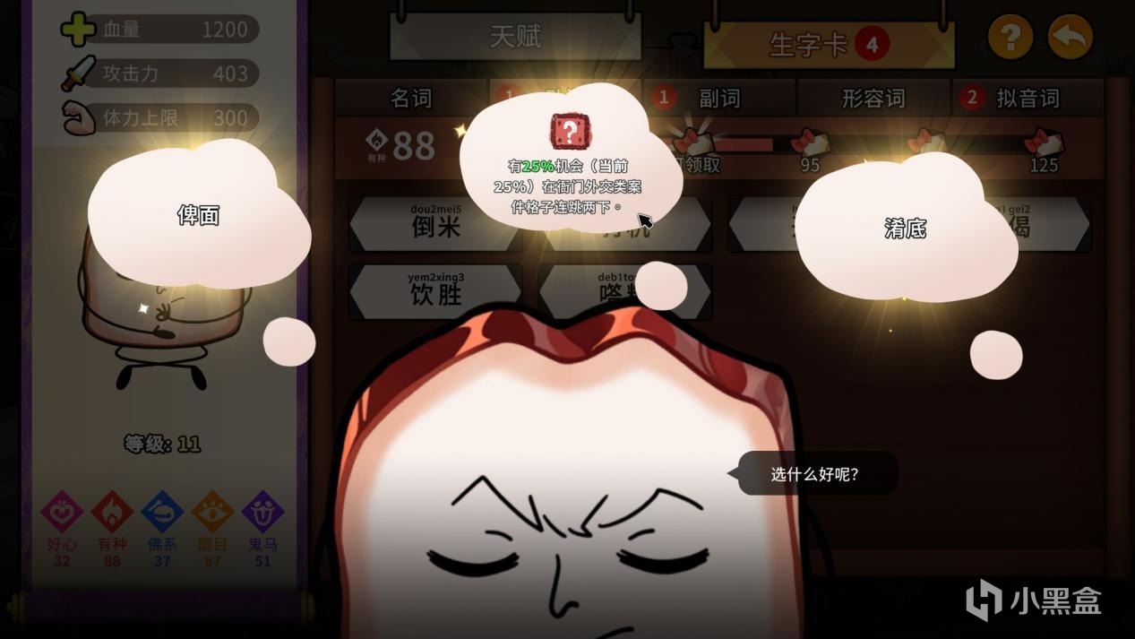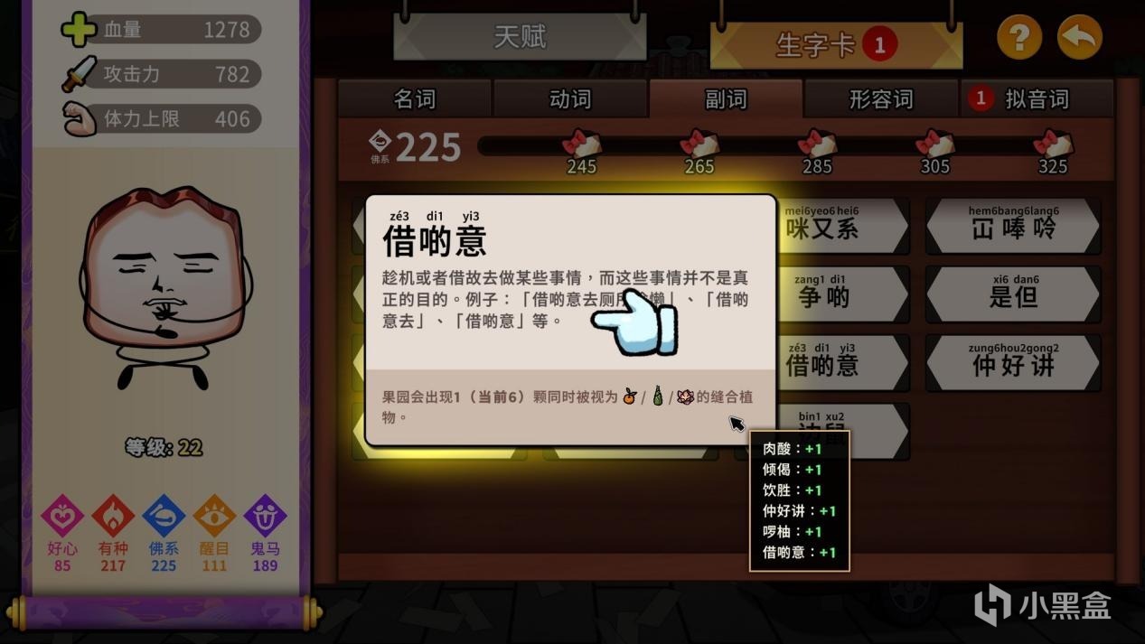 而做得不错,甚至在目前可能具有一定不可替代性的,是游戏相当庞大的粤语词库与详细解读:角色的属性每次获得成长后,都可以通过获得词条来进一步强化面板,而词条本身也就是粤语体系中的那些常用词。