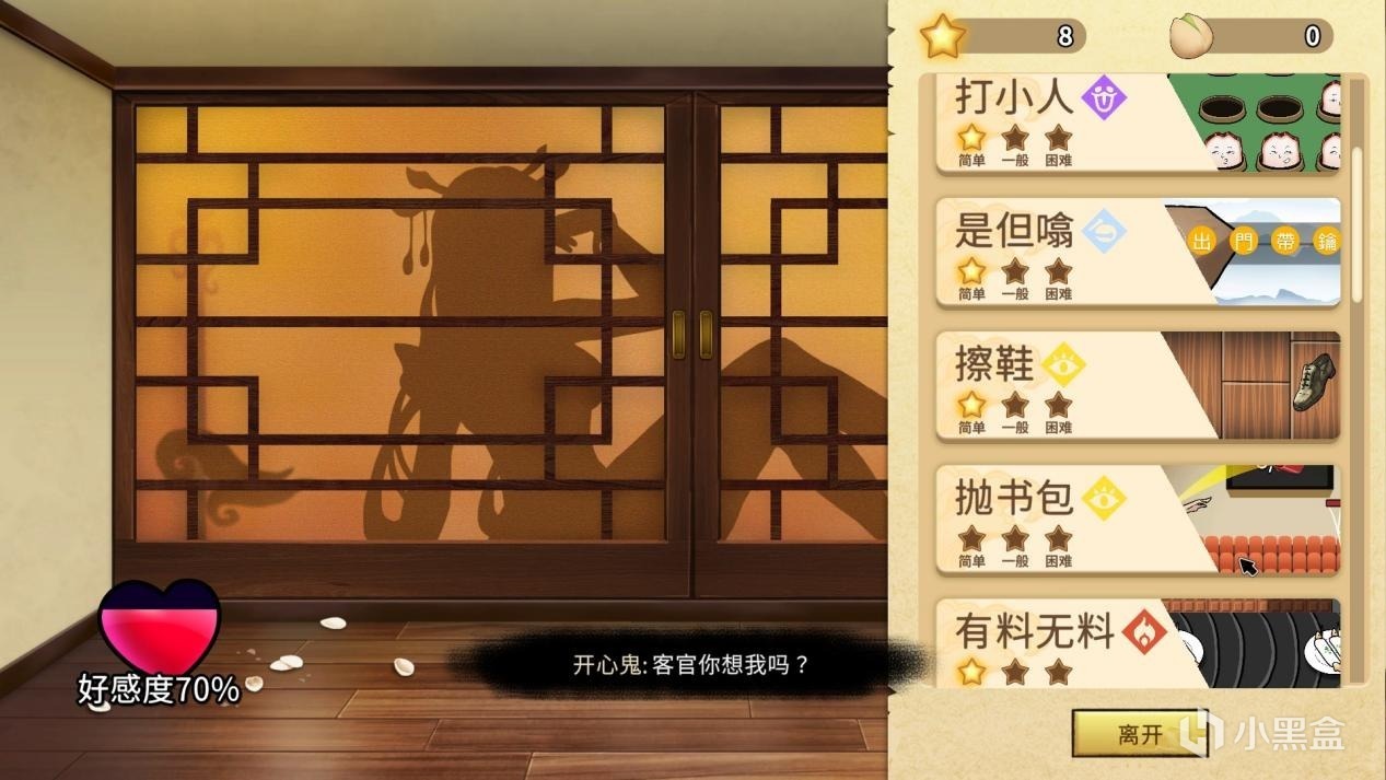 随着关卡和任务的推进,在开心客栈中会解锁出越来越多的小游戏,花费开心果就可以和居于幕后搔首弄姿的开心鬼“悄咪咪”地玩各种不同的游戏: