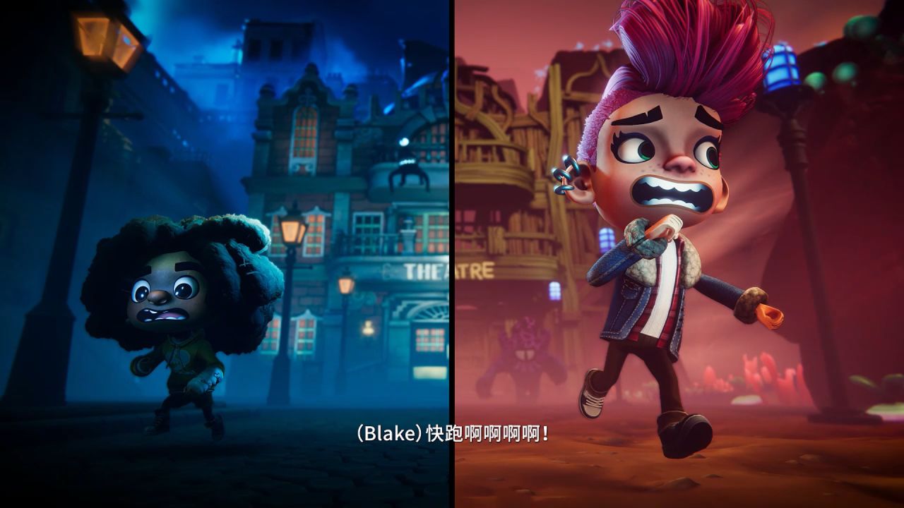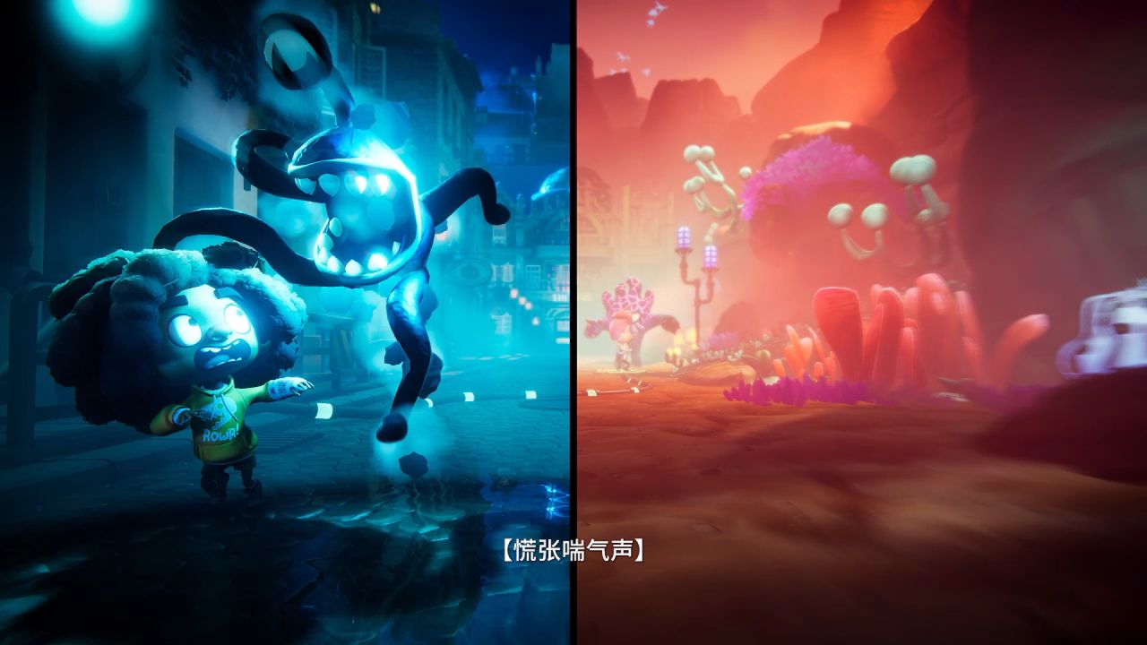 男女雙角色,左右分屏兩種畫風,一場童話世界的奇妙旅程由此展開。在逃跑的過程中,男主打開女主路線上的路燈開關,成功控制住怪物,爭取到了時間,展示雙人合作玩法。