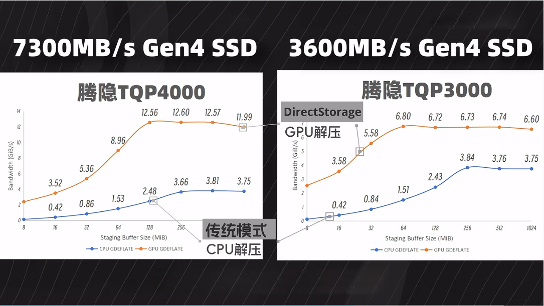 从官方提供的Demo来看同样是使用7000MB/s速度的Gen4 SSD,DirectStorage用GPU直接解压材质可以让游戏的数据带宽,相比传统的CPU解压提升很多倍。
