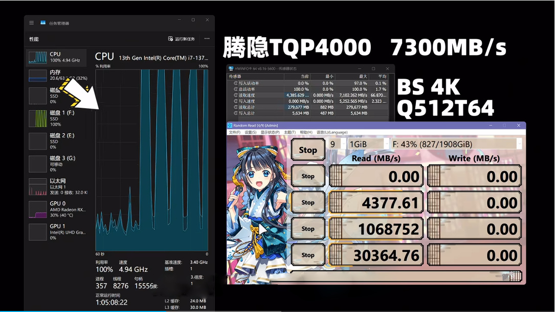 所以交付给显卡之前需要先送给CPU内存哪里解压一遍,再交给显卡来处理生成画面,但是CPU其实根本不擅长长干这事,如果我们让Gen4 SSD满状态工作 CPU占用率瞬间就爆了,这里简单跑个测试大家就明白。