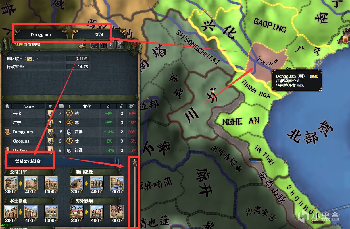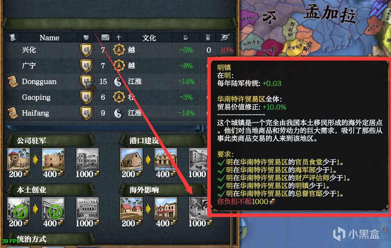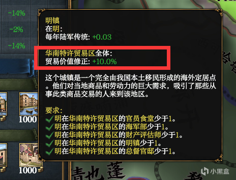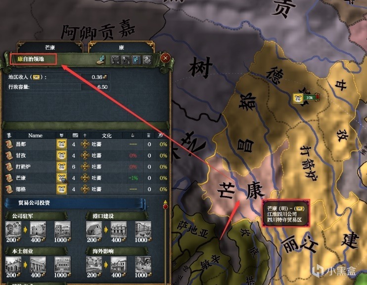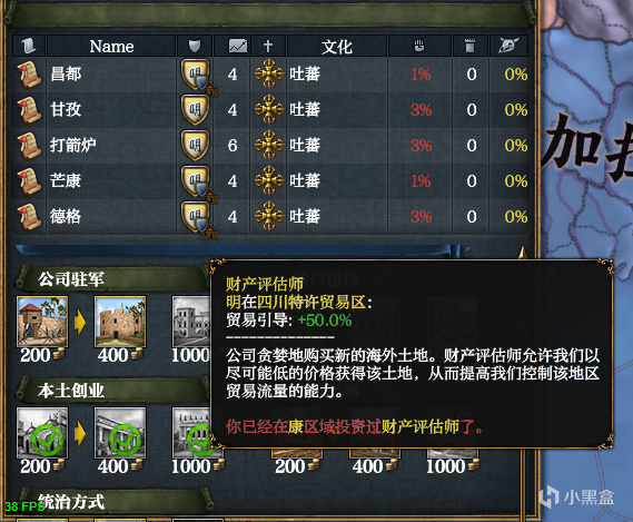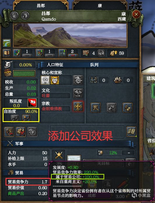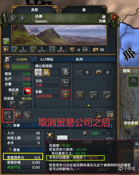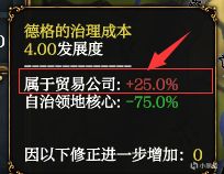 添加貿易公司之後省份貿易競爭力+100%,同時消除了自治度的影響(維基並沒有說明,我認爲是bug),可以較大提高貿易競爭力。
