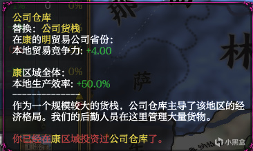貿易公司還有這麼個功能,效果是提高整個地區所有貿易公司省份50%的貿易競爭力(相當於額外鋪一層集市)並且增加年通脹0.03%,這個功能一般沒啥用,可以在漏勺節點開讓他少漏點(1.37.4之前效果作用於整個貿易區省份,很抽象的bug)。