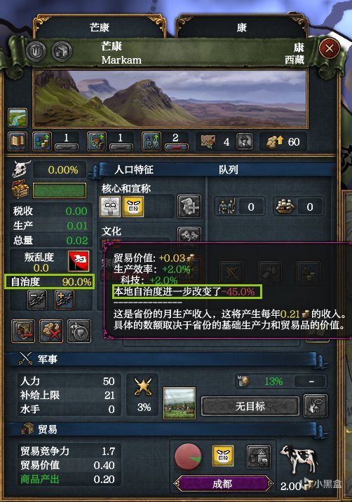 每個省份都會貢獻一定的貿易競爭力(受發展度、自治度影響),貿易競爭力會影響所在貿易區你的佔比,而每-2%自治度導致-1%貿易競爭力,影響你的自治領地的貿易競爭力(-45%,等於減半)。