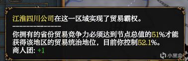 當貿易公司在其所屬的貿易區掌控了超過51%的省份貿易競爭力份額時,貿易公司將給予+1商人團的獎勵(注意是貿易公司的佔比,不是所有省份的貿易額佔比)