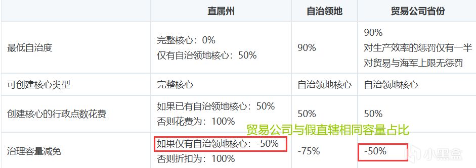 同時與自治領地一樣,最低自治度爲90%。稅收大幅度降低,而貿易公司能使生產收入的計算中自治度的影響減半(-45% = -90% / 2):