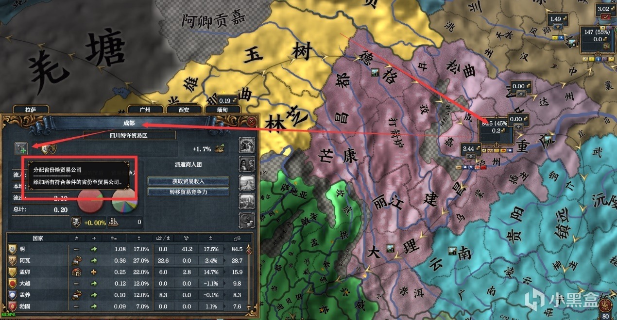 貿易公司與貿易節點相關,每一個貿易節點基本只存在一個貿易公司,可以通過貿易節點內的按鈕立即將指定的貿易節點中所有符合條件的省份添加到該節點所屬的貿易公司: