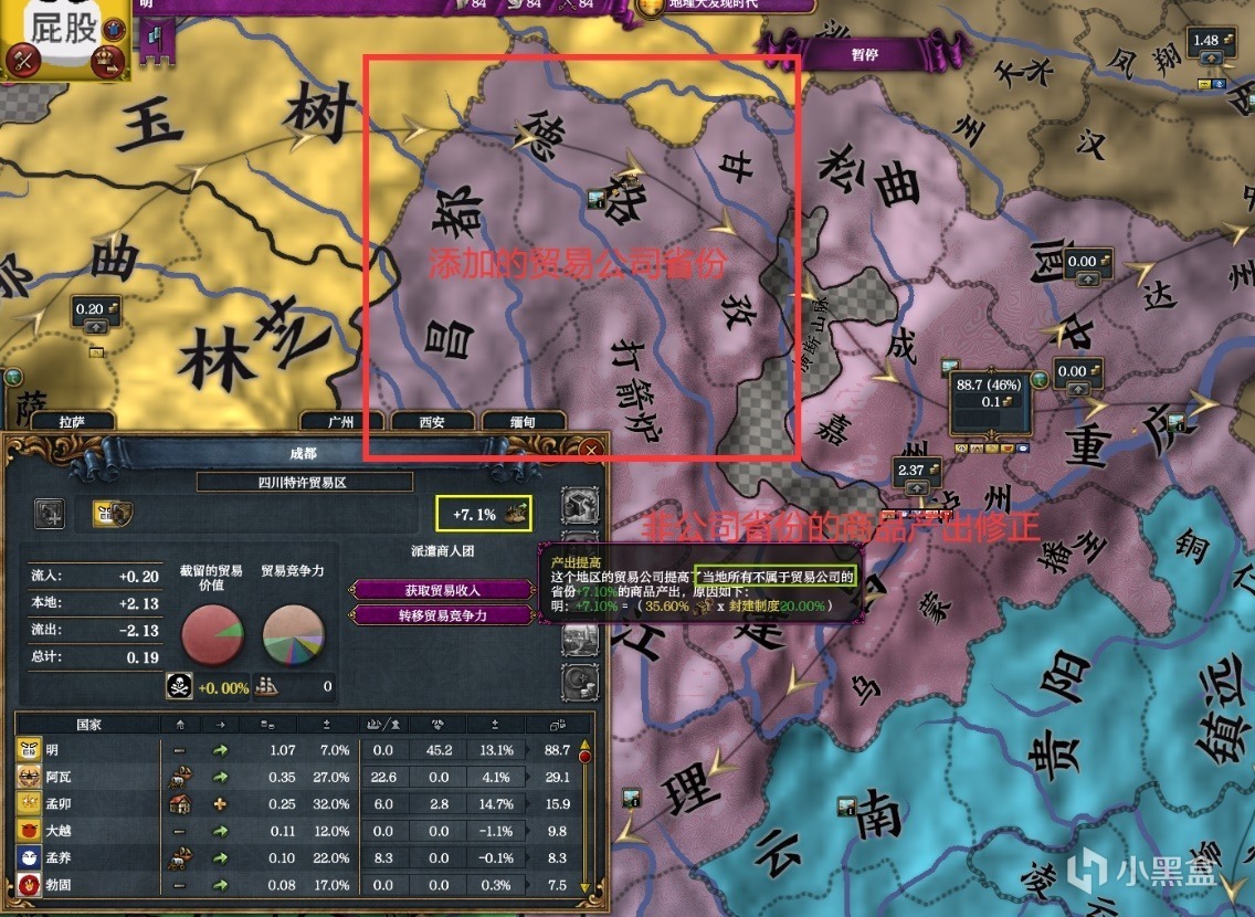 在別的地方我看到有人問要不要全開公司,我的一致回答都是貿易區不要全開公司。全開公司的缺點在於佔容量多(公司比自治領多佔用一倍容量),提高的非公司地塊的商品產出這一塊buff沒了(大頭)。好處是省事,所有異教異文化地都沒懲罰了,一些只作用於貿易公司省份的公司建築的價值可以最大化,但單從貿易角度來看是虧的,少了那麼多產出,其他方面的提升都是徒勞,貿易公司本質目的就是爲了提高貿易收入。