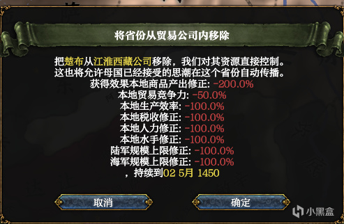這個修正足以讓這些省份的商品產出和貿易價值爲零,請不要隨便添加公司然後再移除。注意,如果你將首都遷移到一個擁有貿易公司的次大陸,這些省份也會被移除出貿易公司並且獲得這項修正(請提前規劃好遷都位置)。