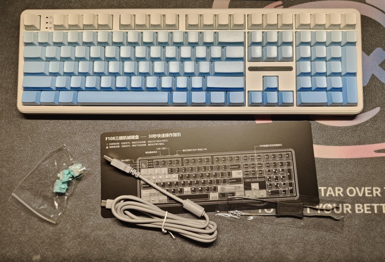 综合来看,狼蛛F108是一款表现全面的机械键盘,兼顾了设计美感、手感表现以及功能性,尤其在三模连接和GASKET结构方面表现出色。对于追求高性价比和多功能性的用户来说,F108无疑是一个极好的选择