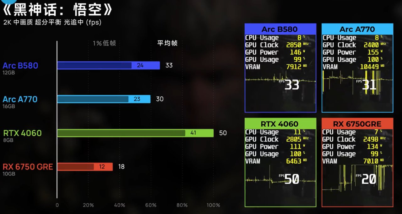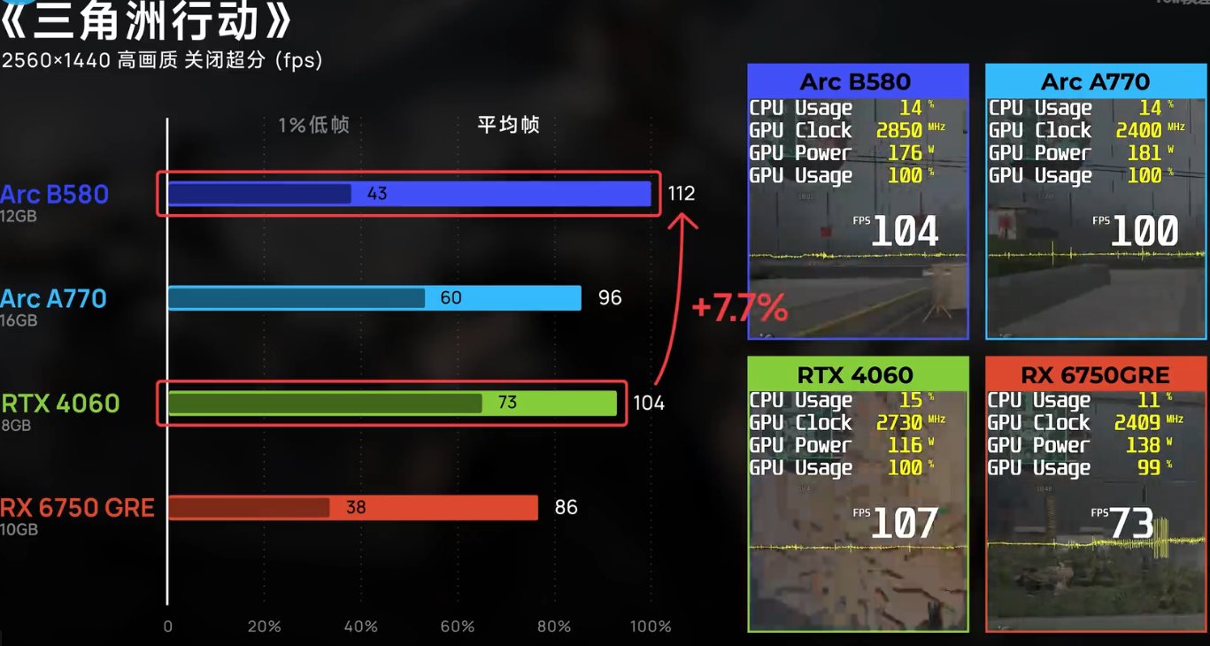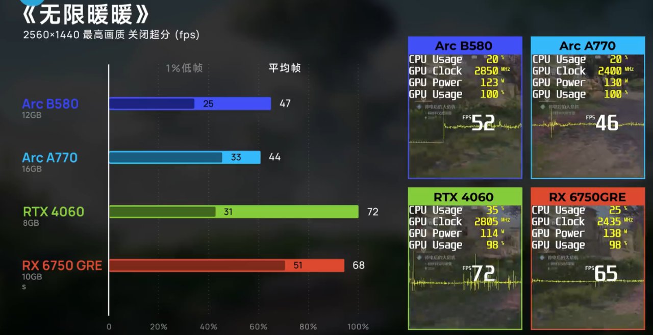 若不考慮光追,只看各大遊戲傳統表現,英特爾的B580相當出色,不少遊戲甚至超過對手