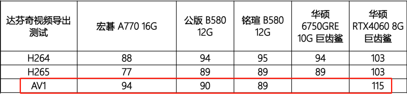 英特爾新卡集成了AV1編碼器,這玩意在使用剪輯軟件、比如達芬奇導出時,選擇AV1格式,速度對比其他顯卡有着得天獨厚的優勢(A卡不支持AV1編碼):