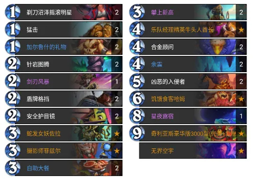 具體操作是:保證手牌中有0費的無界空宇+攝影師+蛇髮女妖,先下攝影師拍照,再下女妖複製攝影師,最後下無界空宇清場。每回合都能用無界空宇清場一次。