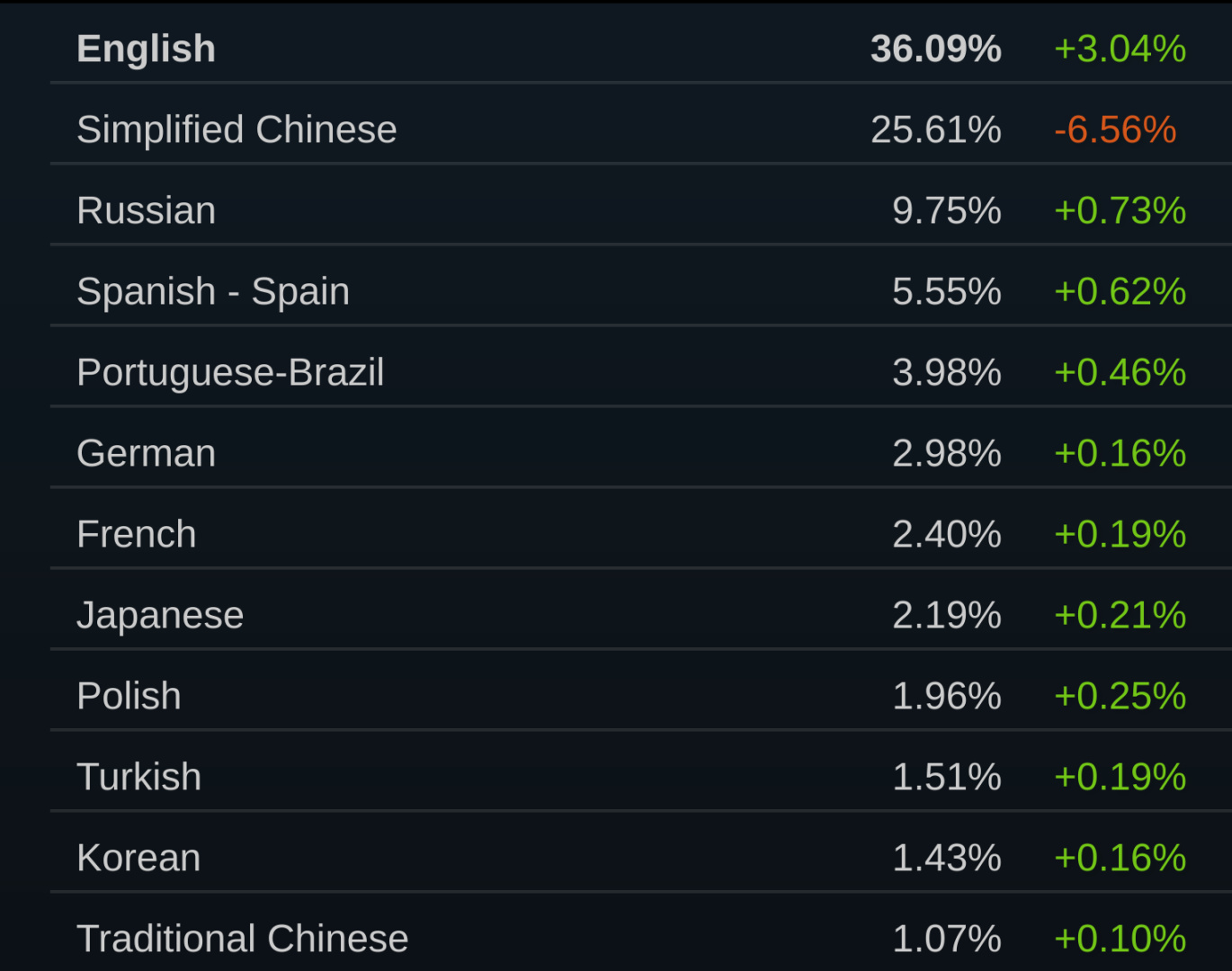 最后是Steam玩家使用语言方面,英语、简体中文、俄罗斯语占据前三,其中英语用户占比36.09%,较上月增长3.04%。简体中文用户排名第二,占比25.61%。俄罗斯语用户排名第三,占比9.75%。