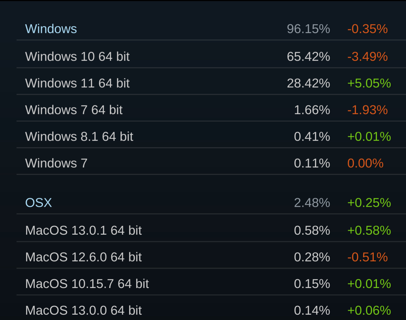 PC操作系统方面,使用Windows操作系统的玩家占总数的96.15%,这其中Windows 10 64 bit以65.42%的占比率高居第一,较上月降低3.49%,后续排名依次为Windows 11 64 bit(28.42%)、Windows 7 64 bit(1.66%)、Windows 8.1 64 bit(0.41%)。而使用OSX的玩家则依然占比较少,仅为2.48%。