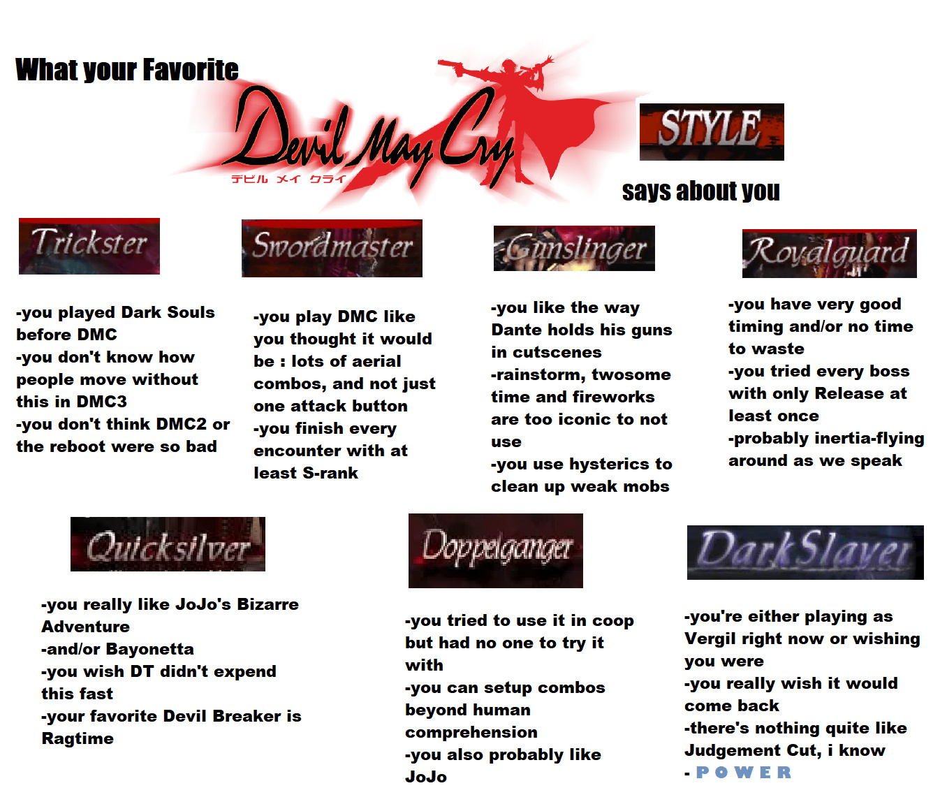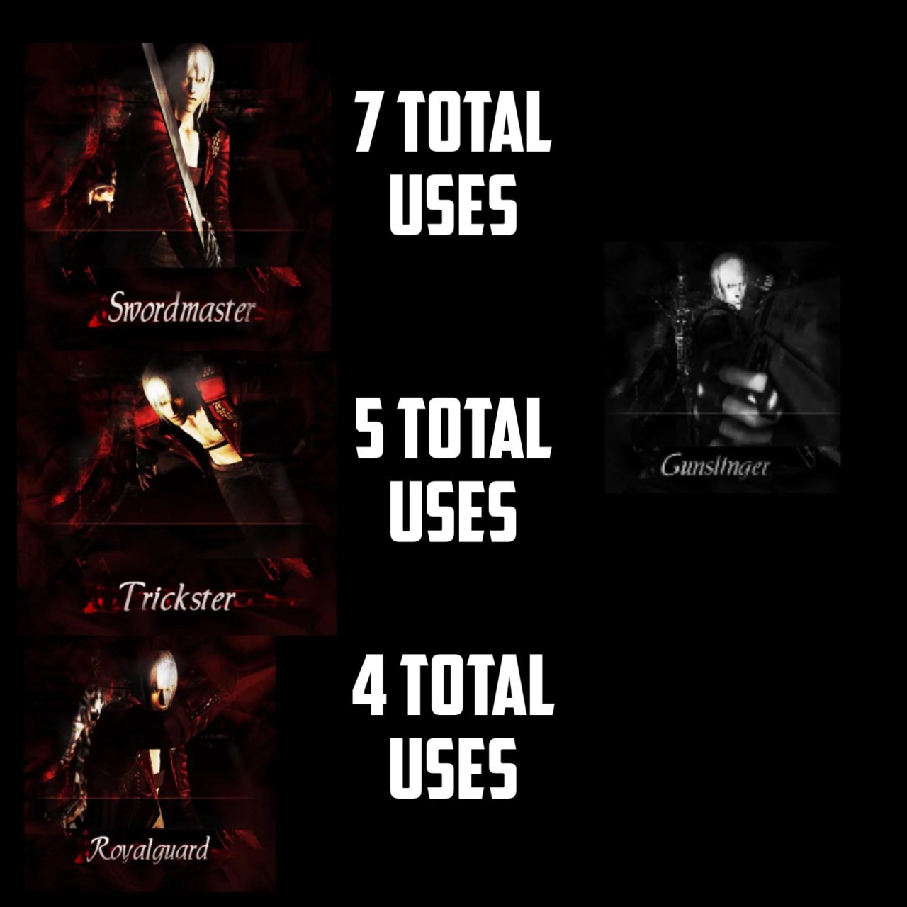 每種風格技都會改變但丁的戰鬥技巧,對戰鬥產生很大的影響。總共有6種風格,遊戲初始風格4種,隨着遊戲的進程,但丁會學會兩種新的風格技。四種初始風格最高等級都是三級,所需升級經驗分別是30000和99999。而後兩種新風格則無法升級。四種初始風格戰鬥時所得經驗只與怪物的種類有關,即便是在不同的難度下,只要是同一種怪物,那麼其經驗也是相等的。