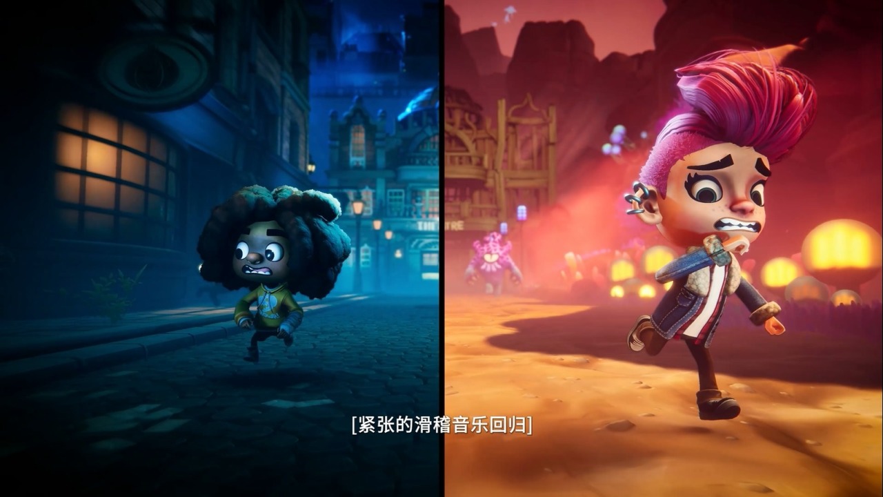 他们的新作《怪镇奇旅》的TGA首曝预告片时长很短,只有56秒,B站上就有(BV号:BV1JAqeY8EY4)。但就是这短短56秒,足以展示出这款游戏的特点——双人合作的玩法,精致的画面,轻松但又不失紧张感的氛围。在这个预告片中,三个小孩在电影院看电影,但被后排的小怪物们打扰到,小怪物看起来人畜无害。