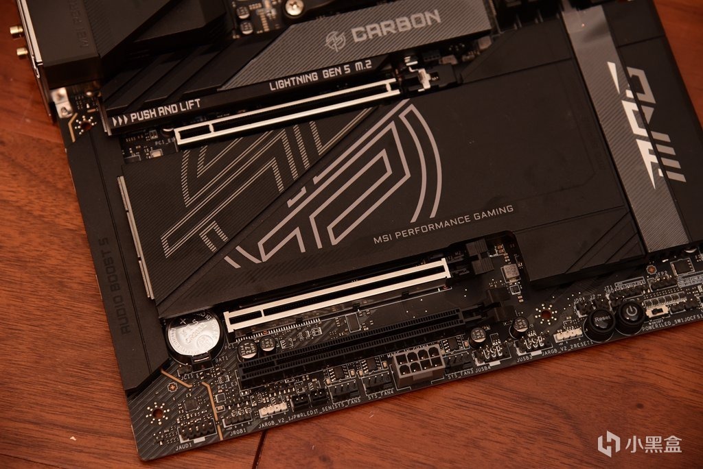 擴展方面:MPG X870E CARBON WIFI配備了3條PCI-E插槽用來安裝顯卡及其他設備,從上到下依次是PCI-E 5.0x16插槽,PCI-E 5.0x4插槽,PCI-E 4.0x4插槽。上面2條PCI-E顯卡插槽覆蓋了合金裝甲,避免在顯卡重壓之下,發生變形或損壞。