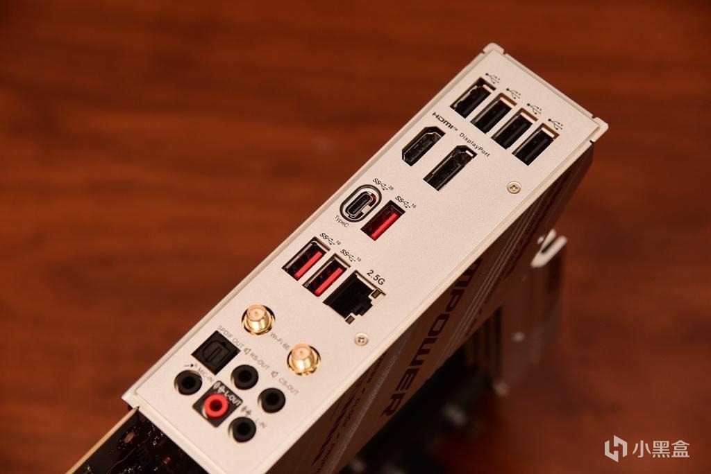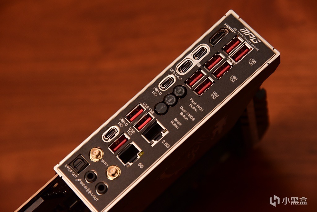 IO接口方面:主板共有13個USB接口,內置了9個USB3.2 GEN 2 A形紅色接口,其中1個是無CPU狀態BIOS刷新專用。2個USB3.2 GEN2 TYPE-C接口,2個USB4.0 TYPE-C接口。網絡接口有1個2.5G高速網卡接口和1個5G高速網卡接口,內置WIFI 7無線網卡。另外,BIOS復位、刷新、按鈕也有配備。視頻輸出方面,內置了的HDMI 2.1接口輸出。