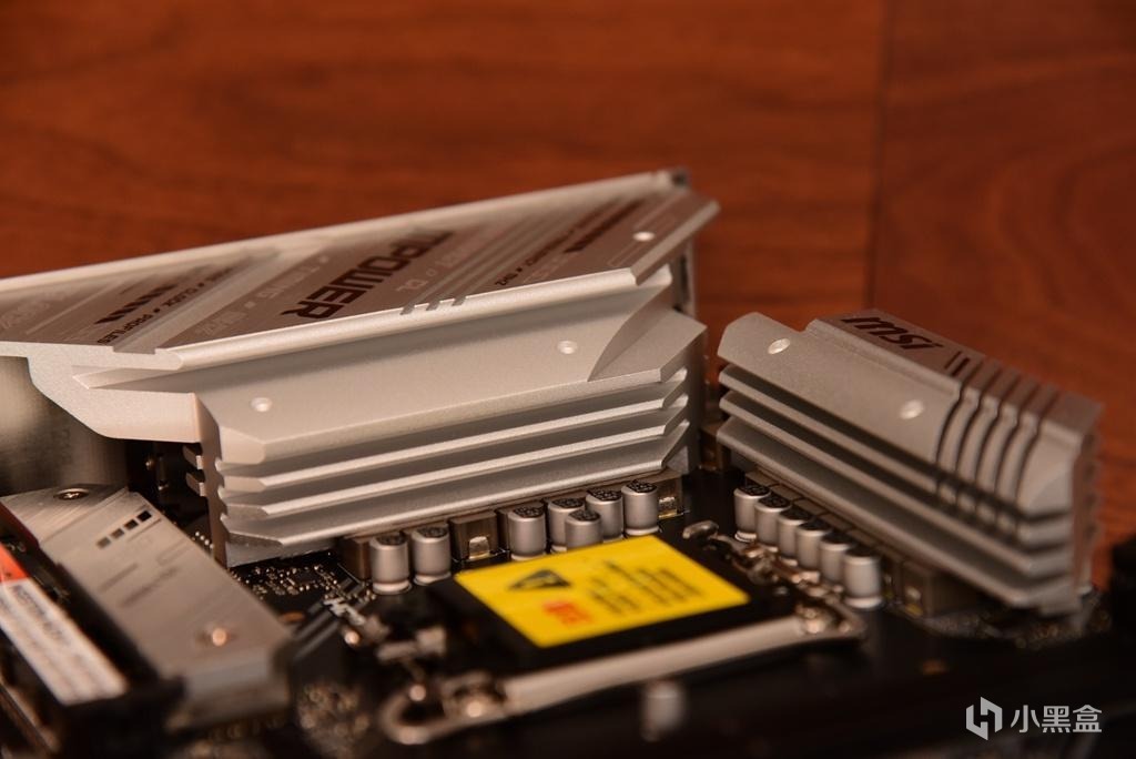 散熱方面:隨着ZEN5平臺硬件性能的提升,必然會造成散熱的增加,主板上覆蓋的一體式白色散熱裝甲上採用金屬拉絲處理,不僅提升了整體質感,還增強了散熱效果。