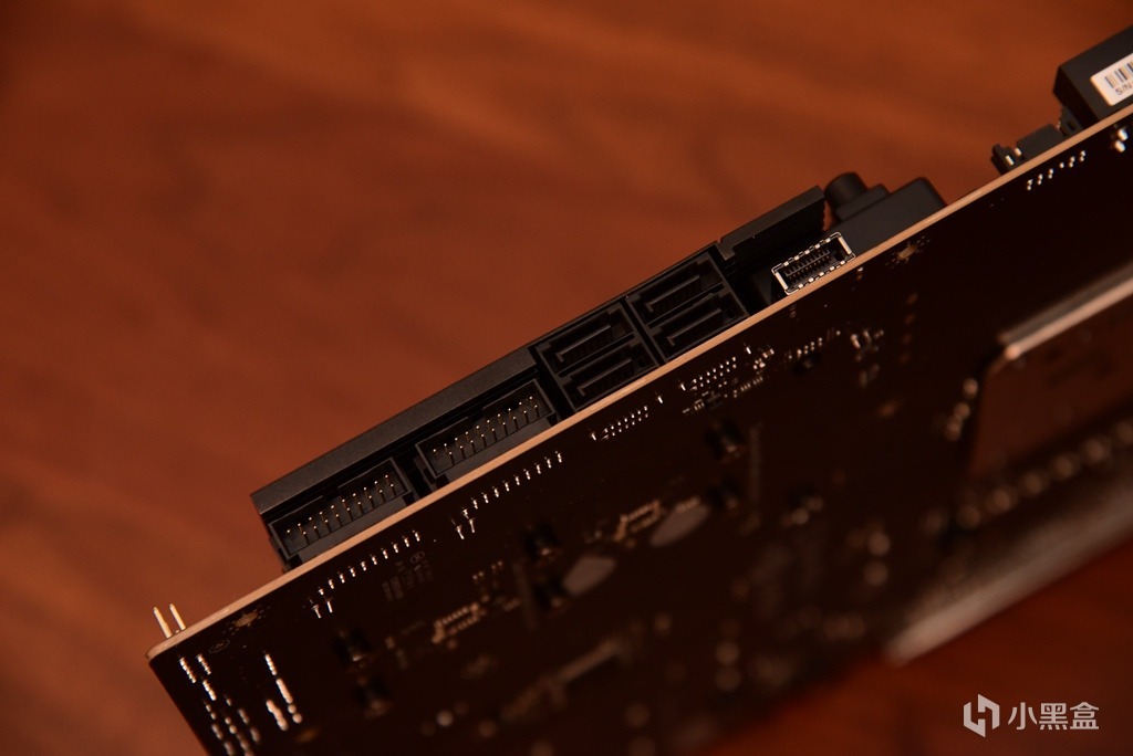 主板上配備了TYPE-C前置、DEBUG燈、顯卡易拆按鍵、2組USB3.0前置插槽,南橋芯片共控制有4組SATA接口,全部爲橫置安裝方式,節省了主板上方的空間。