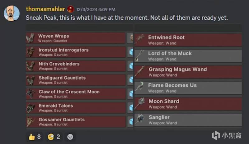 EA版目前有超70種武器,而官方依舊會不斷加入新武器。早前官方給出了正式版200種武器的可能性。這幾個月中主要放出了幾種讓大家比較期待的類型。拳套或拳刃將會是下個更新中會出現的武器之一。目前根據網上爆料的實機演示看,拳套似乎是主打遠程,類似衝擊波的進攻方式,並且附帶範圍傷害。同時官方還放出了對應拳套的相關階段性內容,同時對應魔杖方面的內容也有公佈
