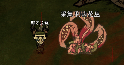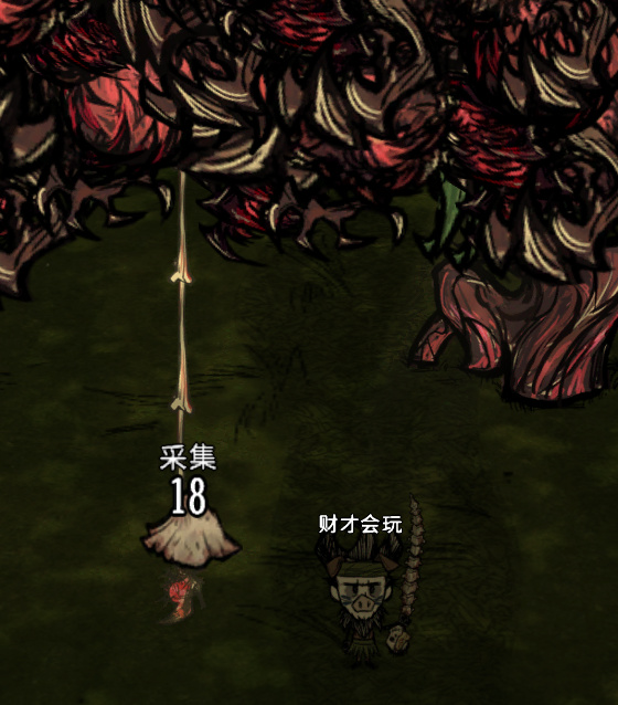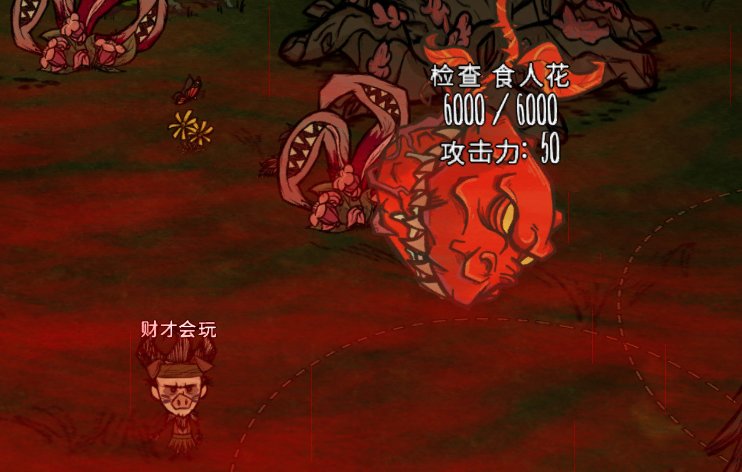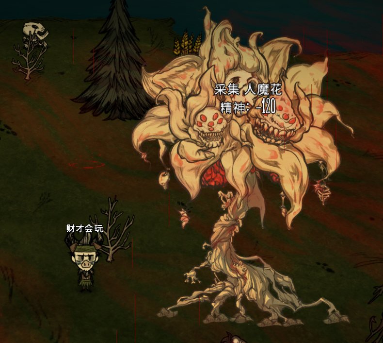 人魔花:生成在深淵大陸上,有4個。無法砍伐,無法燒燬。靠近人魔花每秒掉2點理智。擁有倆個階段:初始階段一,5天后進入第二階段,第二階段可以採摘,採摘後扣20san並掉落白骨,神祕的肉,採摘後回到第一階段。