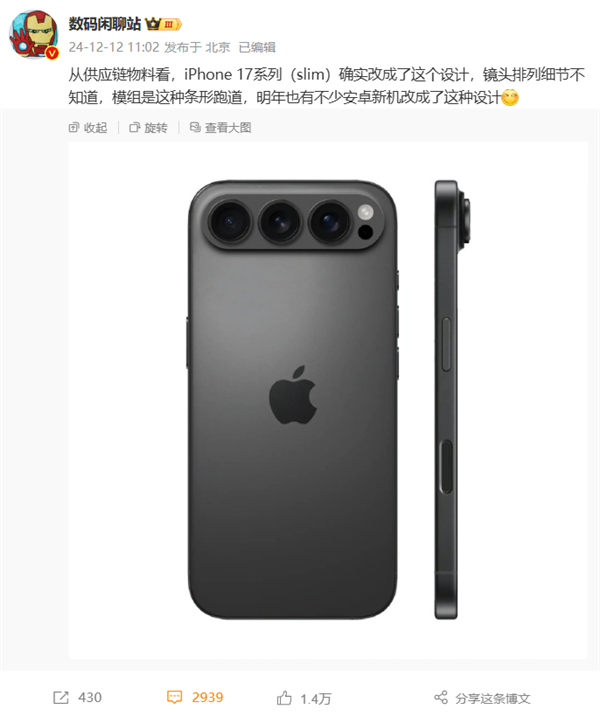 快科技12月17日消息,日前,數碼博主“數碼閒聊站”爆料稱,根據供應鏈消息,iPhone 17系列的後攝模組將改爲條形跑道設計。