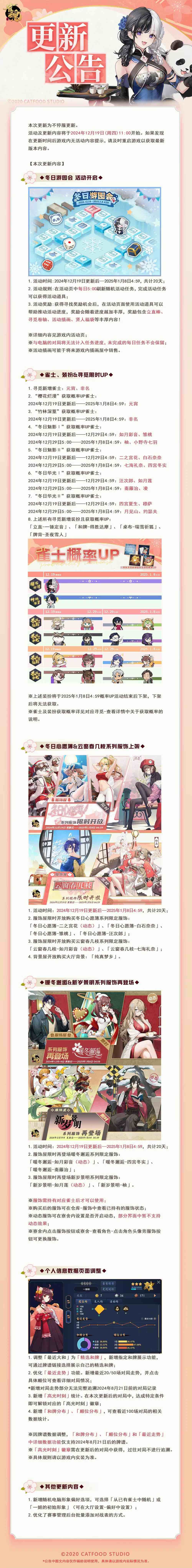 本次更新爲不停服更新。活動及更新內容將於2024年12月19日(週四)開始。如果發現在更新時間後遊戲內無活動內容提示,請及時重啓遊戲以獲取最新版本內容。