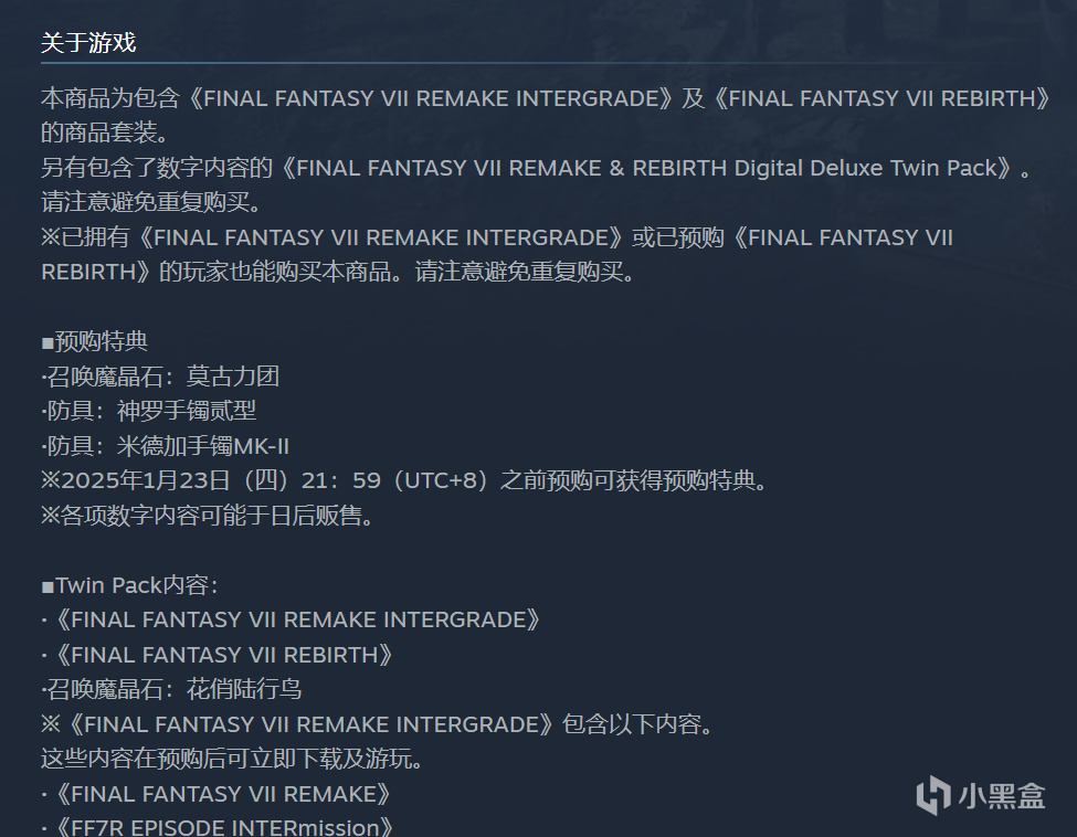 但如果你需要购买两部曲的捆绑包,那就需要注意一个事情。第一种情况是你已经拥有了《最终幻想7重制》的情况下,再次购买这个包是不支持补齐的,所以需要避免重新购买之后花了更多的钱只有重生,第二种就是两部曲都没有,那你就会获得最大的优惠,同时拿下两部!
