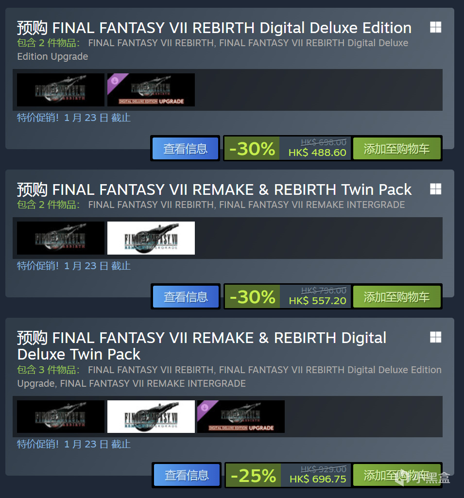这里就是捆绑包的内容了,主要针对的还是《最终幻想7》的重制版以及重生两部曲,这两部在一起的时候能够再次享受到一个-30%的五折促销,基础版本两个捆绑下来只需要四百多,相当于比单独买重生只多了几十块。