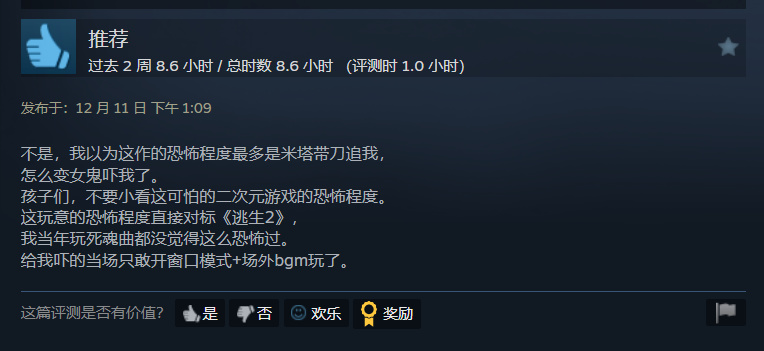 最後也不打分了,畢竟在恐怖遊戲這一塊咱不是專業的,簡單說一下感受吧:我感覺對於我一個非常不喜歡恐怖遊戲的玩家來說,《米塔》因爲畫風原因,恐怖程度其實還可以接受,且各種逃生解密玩法也比較豐富,更重要的是,老婆也比較豐富。