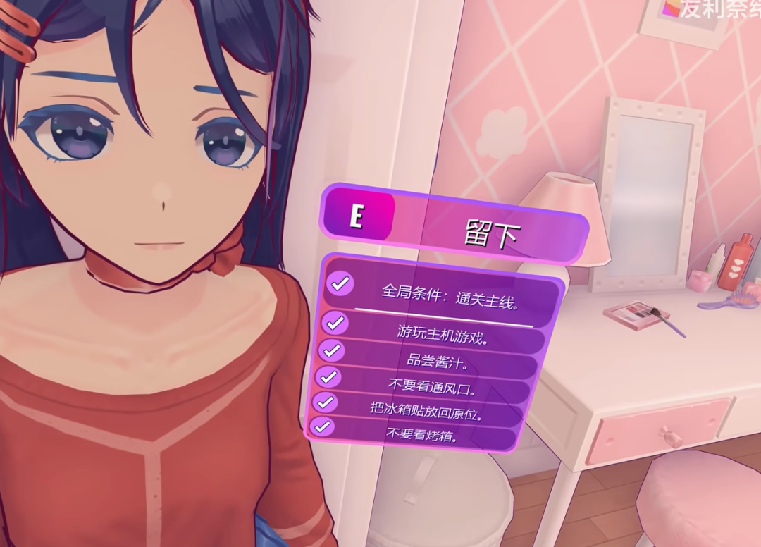 遊戲完全通關大概在5小時左右,一共有三個結局,咱們可以先在這裏劇透一個“留下結局”——當你發覺屋內異常,想要打開櫃子時,如果你滿足了一些特定條件,則可以選擇聽從米塔的話,不打開櫃子。