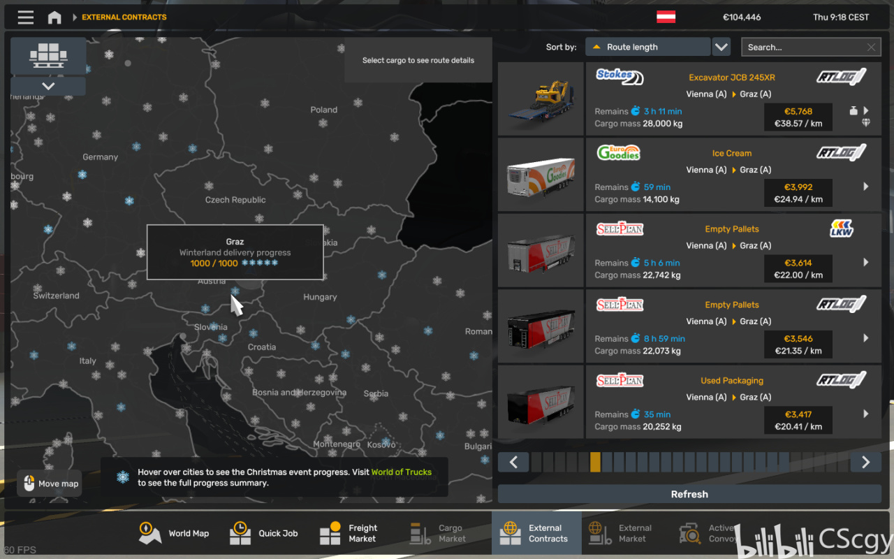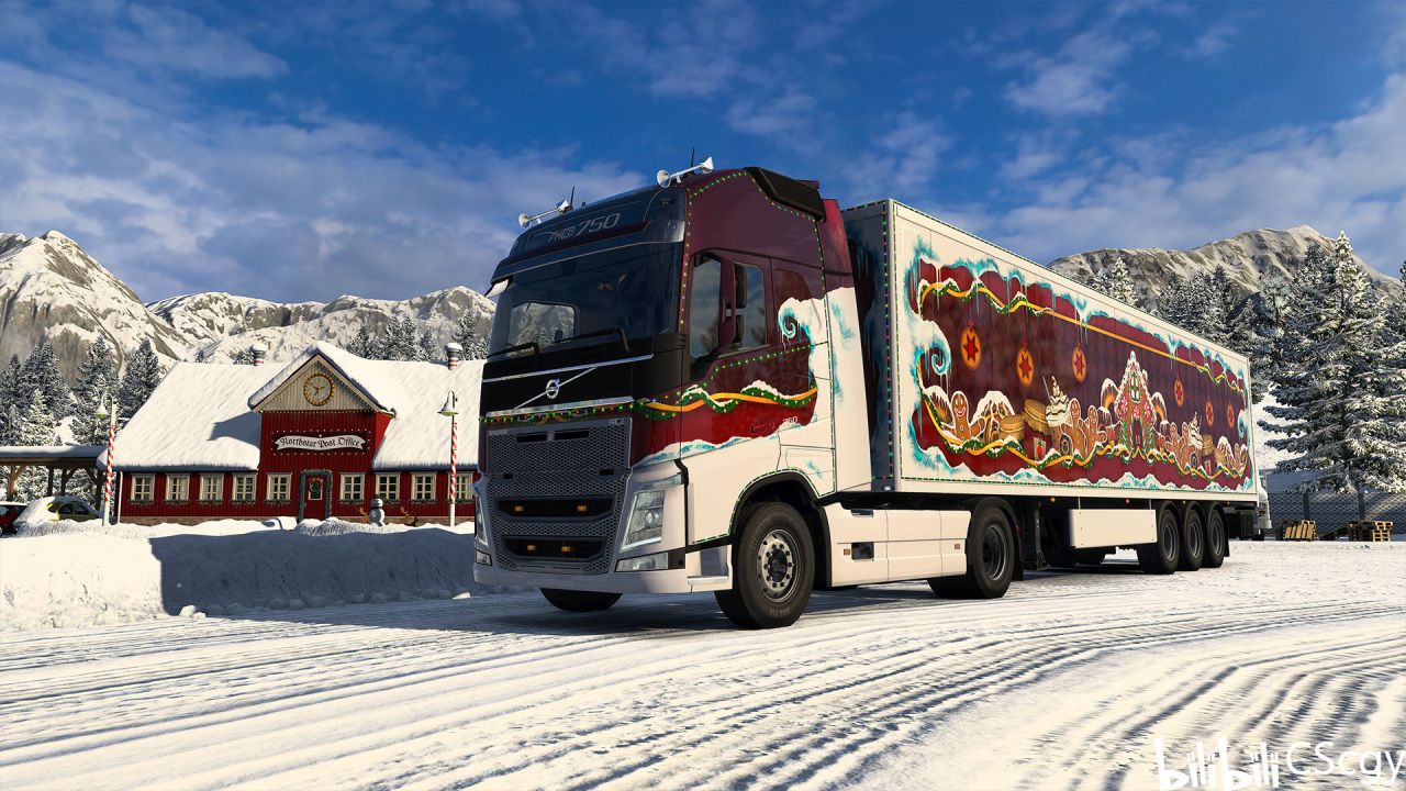 12月16日,SCS发布最新预告,宣布欧卡2/美卡的圣诞节活动正式来临!本次活动中欧卡2场景将进入冬季,不再是一直不变的中欧夏令时!此次任务虽然是Winterland活动的回归,然而本次活动与往年有所不同:社区任务分5个阶段解锁5个挂件,传统的点对点运输任务的拉货地Winterland并不是地图上一个固定的地方,而是在地图上随机出现传送门出入。并且除了传统的点对点运输任务,玩家还可以根据提示提示在地图上寻找丢失的礼物,然后运往指定地点。