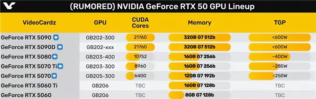 根据当前的传闻信息,RTX 50系列的详细规格如下: