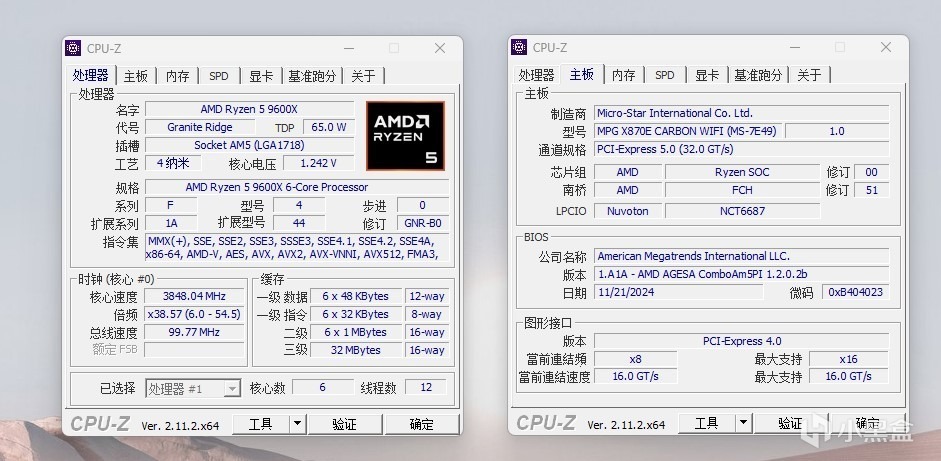 运行CPU-Z,我们看下CPU和主板都是正确识别。CPU是R5 9600X,主板是微星MPG X870E CARBON WIFI。