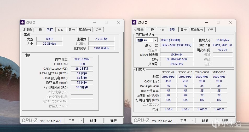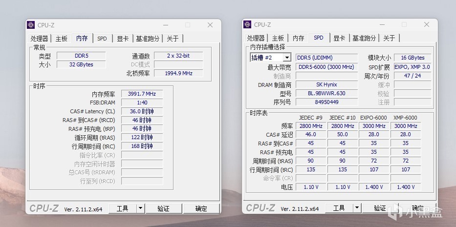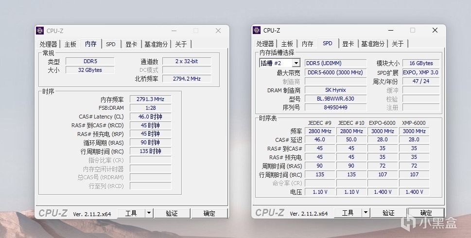 CPU-Z内存,我们看是海力士颗粒,默频5600MHz,支持EXPO和XMP6000MHz,意味着它不仅仅支持AMD平台超频,同样也支持Intel平台超频。时序是28-35-35-72,电压仅1.4V。这意味着同市面其他多数同频率产品相比较,仅需要更低电压即可稳定运行,具备更好的超频体质和超频余量,是玩家组建新一代AMD&lntel高性能主机首选配置。